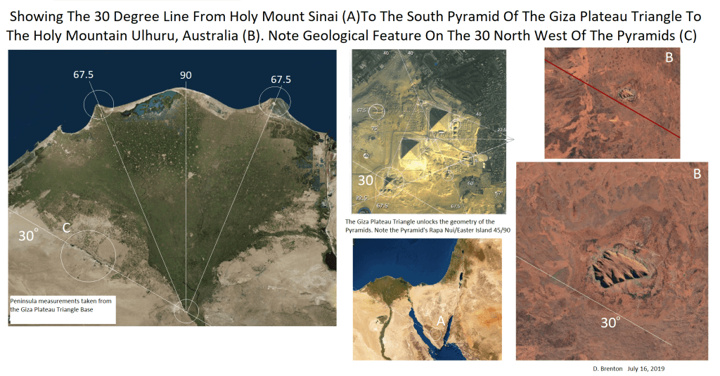 This explains why the 30 degree line from Holy Mount Sinai and the south Giza pyramid hits the outside erosion ring of Holy Mount Ulhuru. What an amazing pin-point line of famous places.