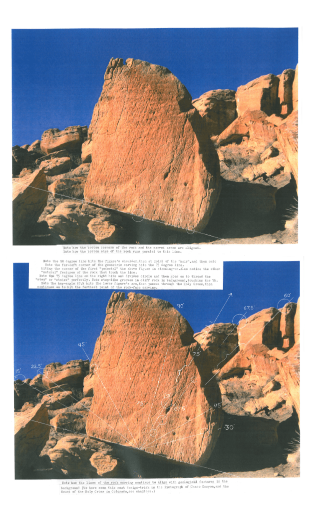 Please view the chapter on the Hopi Prophesy Rock, showing that the petroglyphic symbols, and, amazingly, the rock features as well, positioned at the same basic math angles as seen on Earth and in the Heavens.