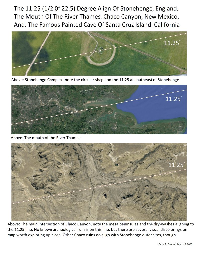 This line also passes through the geological intersection of Chaco Canyon, and onto the Sacred Painted Sea Caves of Santa Cruz Island off the coast of California, where it intersects with the 22.5 (1/2 of 45) line from Sacred Rainbow Bridge, Arizona