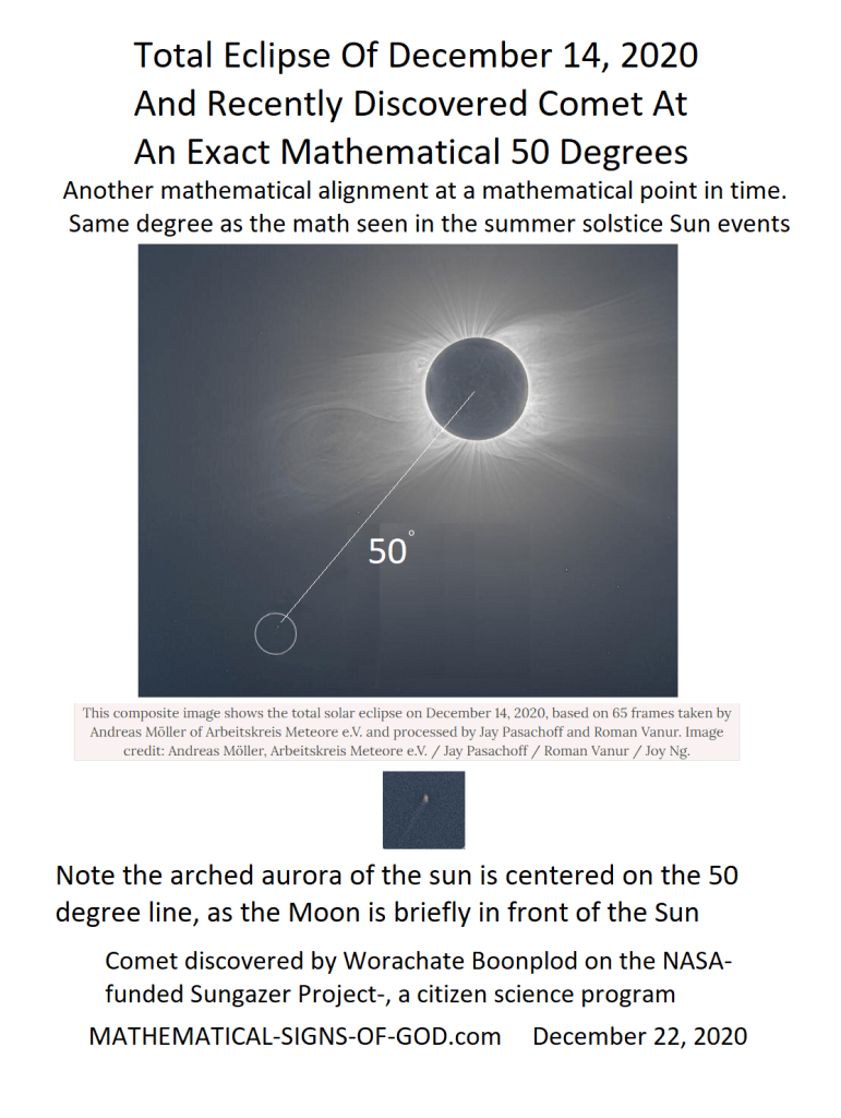 23 Dec 2020 by God's Math Pattern of the Heavens and Earth Newly Discovered Comet At The Total Eclipse Of The Sun Is At A Mathematical 50 Degrees At Totality, Page 1 Uncategorized Leave a comment This is the same degree seen in the Summer Solstice mathematical and geometric events ! Calculate the odds. Share this: Click to share on X (Opens in new window) X Click to share on Facebook (Opens in new window) Facebook Like Loading... Related