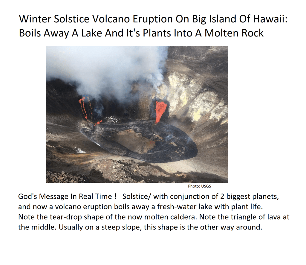 24 Dec 2020 by God's Math Pattern of the Heavens and Earth Hawaii Volcano Boils Away A Lake And It’s Plants, On The Winter Solstice Uncategorized Leave a comment This is a warning and message right here, what a statement and perhaps a prophesy. Share this: Click to share on X (Opens in new window) X Click to share on Facebook (Opens in new window) Facebook Like Loading... Related