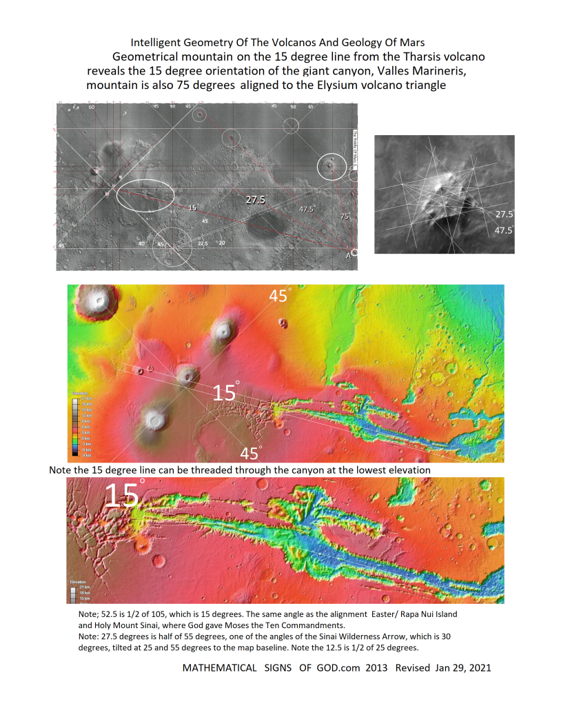 29 Jan 202130 Jan 2021 by God's Math Pattern of the Heavens and Earth The Giant Canyon Of Planet Mars, Valles Marineris, Is Orientated At 15 Degrees, Pointing To Geometric Mountain Of Same Math Pattern Image Uncategorized grand canyon, mars, valles Mrineris Leave a comment Share this: Click to share on X (Opens in new window) X Click to share on Facebook (Opens in new window) Facebook Like Loading... Related