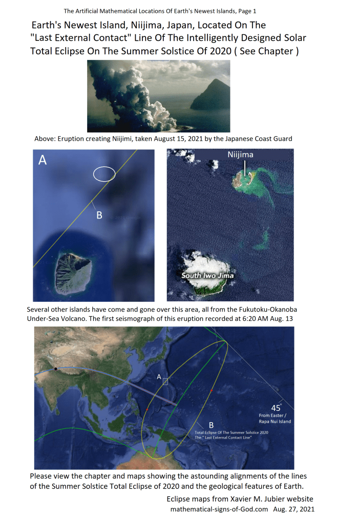 28 Aug 2021 by God's Math Pattern of the Heavens and Earth Earth’s Newest Islands: Mathematical Alignments In God’s Pattern Of The Cosmos, Page 1 Image Uncategorized Japan, New Island, Niijima, Total Eclipse 2020 Solstice Leave a comment Share this: Click to share on X (Opens in new window) X Click to share on Facebook (Opens in new window) Facebook Like Loading... Related
