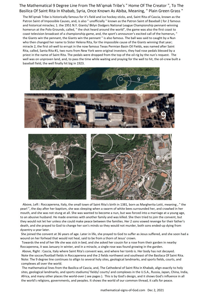 God’s Last Chance Call For Peace: Saint Rita, The Patron Saint Of Impossible Causes: World-Wide Mathematical Aligns Of Sports Fields, Courts, And Stadiums