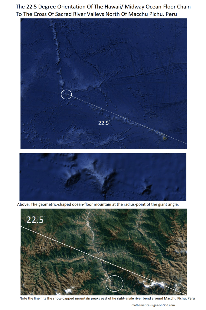 28 Mar 2022 by God's Math Pattern of the Heavens and Earth Hawaiian/ Emperor Ocean-Floor Volcanic Angle 22.5 Degrees To The Holy Cross Of The Sacred Rivers Of Machu Picchu, Peru Image Uncategorized Leave a comment Share this: Click to share on X (Opens in new window) X Click to share on Facebook (Opens in new window) Facebook Like Loading... Related