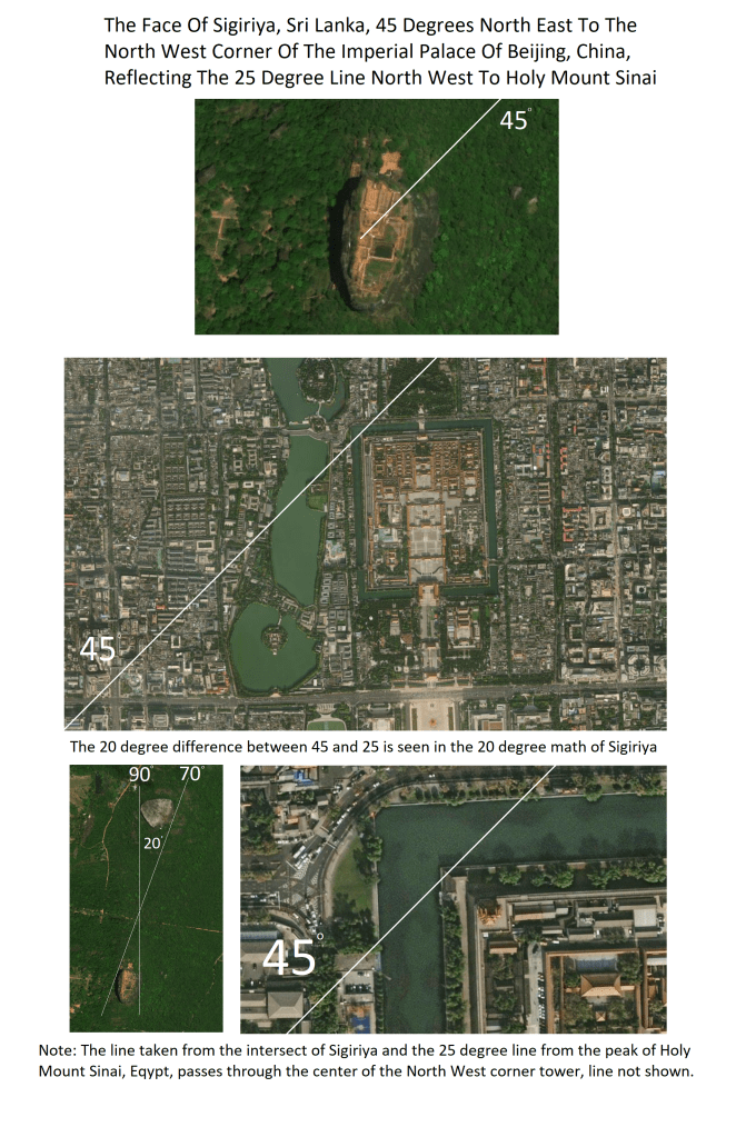 9 Apr 2022 by God's Math Pattern of the Heavens and Earth Page 522: Sigiriya 45 Degree Line To The North West Corner Of The Imperial Palace, Beijing, China: Reflecting The 25 Degree To The Peak Of Mount Sinai In Sigiriya’s 20 Degree Positioning Image Uncategorized Imperial Palace, mount sinai, Sigiriya Leave a comment