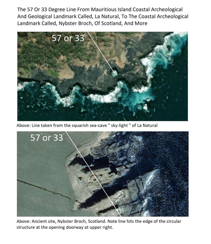 CORRECTION: 57 degrees, not 70, sorry everybody ! Mauritious Island’s Pyramids, Point La Natural, Aligned At 57, not 70, Degrees To Ancient Site Of Nybster Broch, Scotland