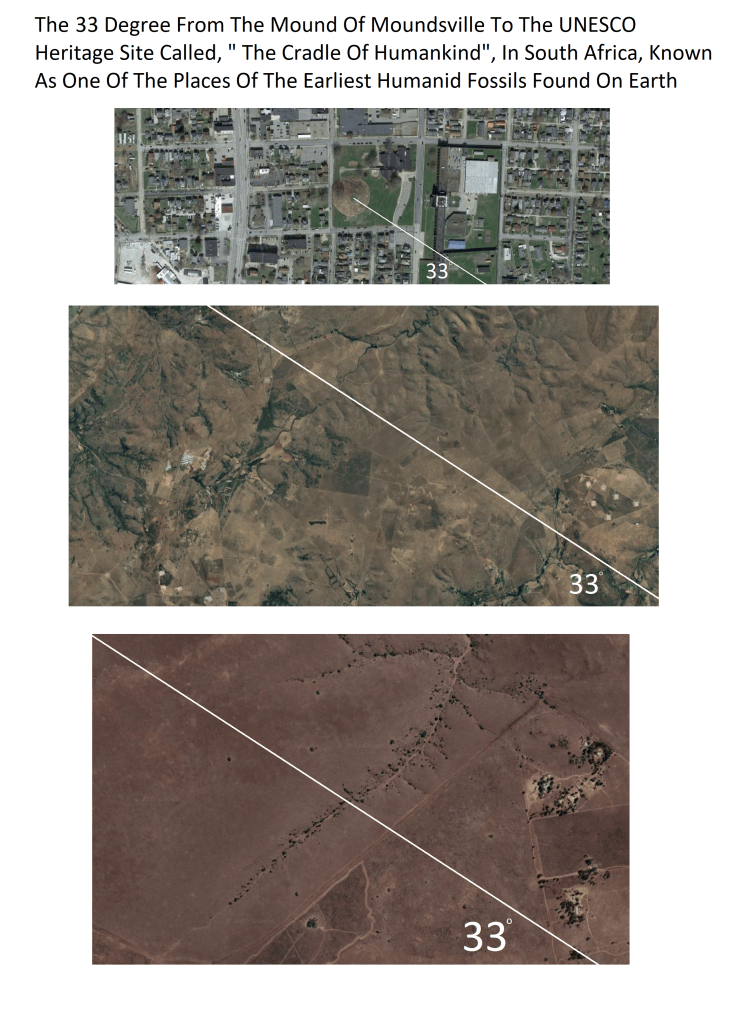 The 33 Degree From The Mound Of Moundsville To The UNESCO Heritage Site Called, ” The Cradle Of Humankind “, In South Africa, Site Of The Oldest Humanid Fossils On Earth
