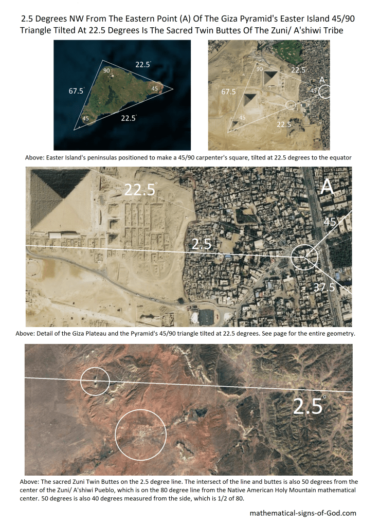 23 Sep 2022 by God's Math Pattern of the Heavens and Earth Mathematical 2.5 Degree Line From The Giza Pyramid’s 45/90 Easter Island/ Rapa Nui Triangle To The Sacred Twin Buttes Of The Zuni/ A’shiwi Tribe Image Uncategorized Giza Pyramids, Zuni Twin Buttes Leave a comment Share this: Click to share on X (Opens in new window) X Click to share on Facebook (Opens in new window) Facebook Like Loading... Related
