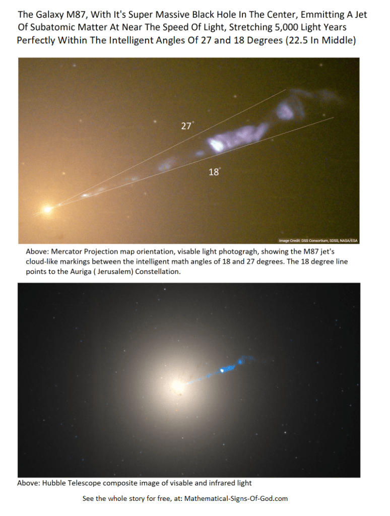 Near Lightspeed Subatomic Matter Jet of the massive black hole of Galaxy M87 is within the intelligent angles of 18 and 27 degrees in a Mercator projection map.