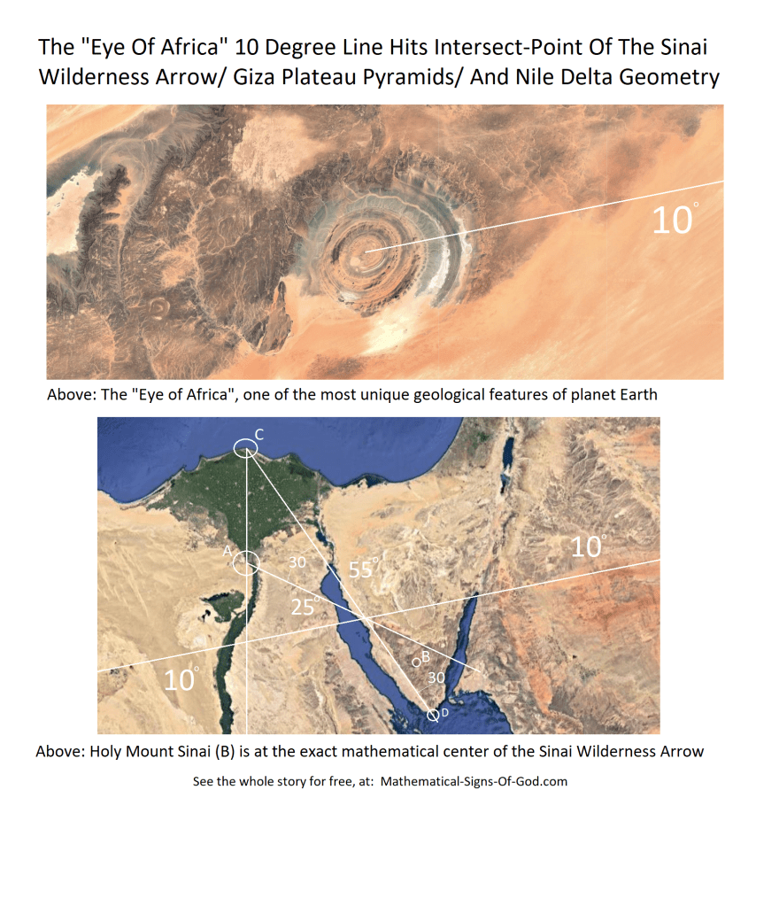 Famous “Eye of Africa” geological feature 10 degree line hits the intersect-point of the geometry of the Sinai Wilderness Arrow/Giza Pyramid Plateau/Nile River Delta