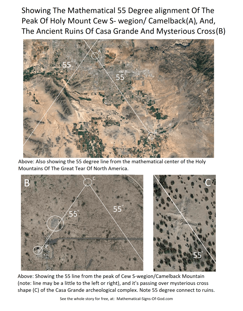 Casa Grande Archeological site at a mathematical 55 degrees from the peak of Phoenix’s Holy Mount Cew S-wegion, which reflects Phoenix’s location on the 55 degree line from the Holy Mountain Mathematical Center