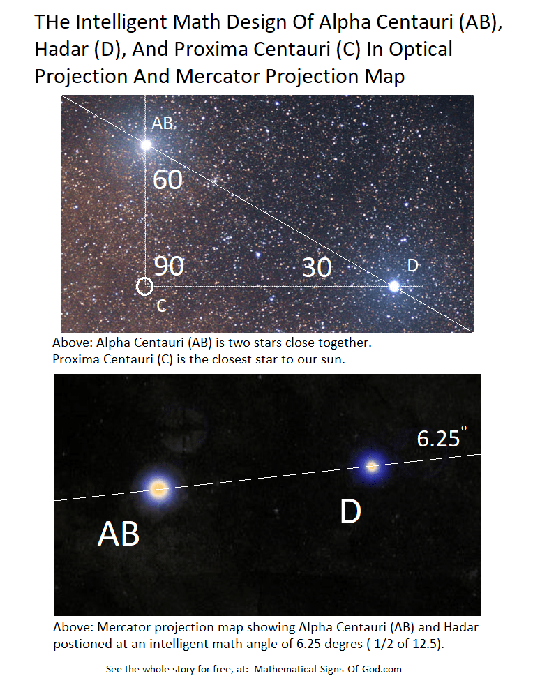 Showing Alpha Centauri, Hadar, and Proxima Centauri ( pointer stars of the Southern Cross) at intelligent math positions in both Optic projection and Mercator projection maps