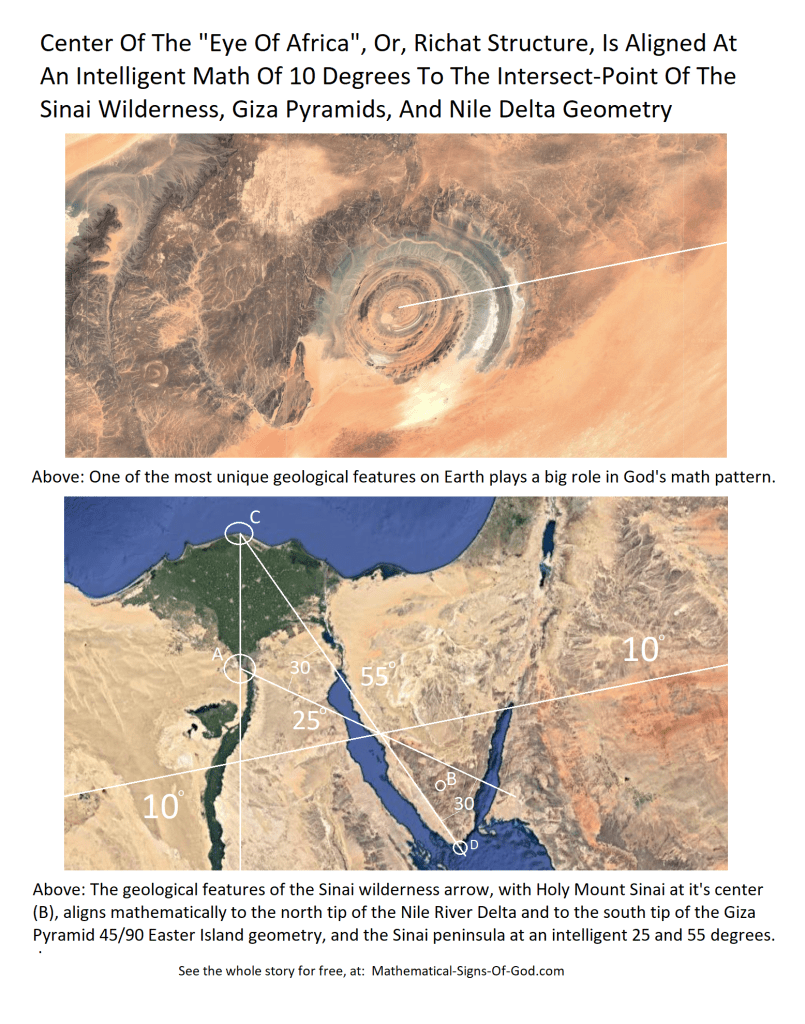 26 Jun 2025 by God's Math Pattern of the Heavens and Earth The Famous Richat Structure, the “Eye of Africa”, is an intelligent 10 degrees from the intersect-point of the Sinai Wilderness arrow, Giza Plateau, Nile Delta geometry. Image Uncategorized Leave a comment