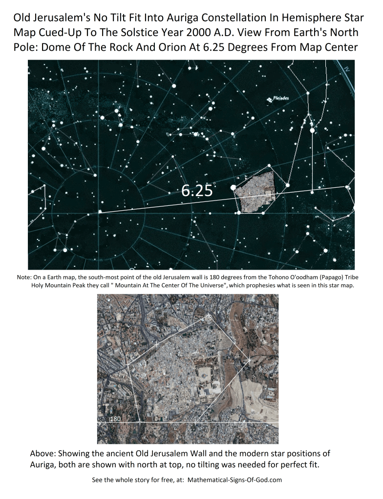27 Jun 2025 by God's Math Pattern of the Heavens and Earth Old Jerusalem’s perfect fit into the modern position of the stars of Auriga constellation in Hemisphere star map, cued to the solstice year 2000 A.D. view from Earth’s north pole. Dome of the Rock at 6.25 degree from map center. Image Uncategorized Leave a comment
