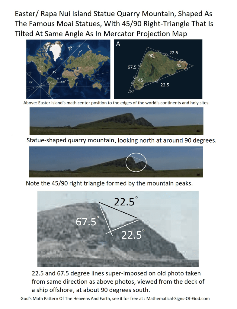Easter Island statue quarry mountain has the same shape of famous Moai statues with a 45/90 right-angle tilted at 22.5 degrees when viewed from 90 degrees south (or north)