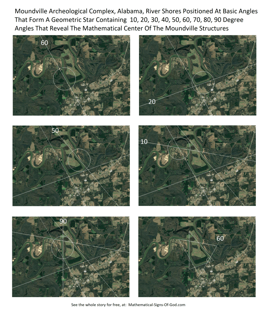 Moundville Alabama archeological site and the straight-lined shores of the Black Warrior River positioned at the most basic angles to form a complex geometric star:
