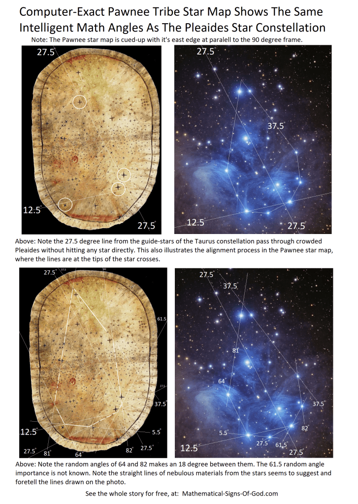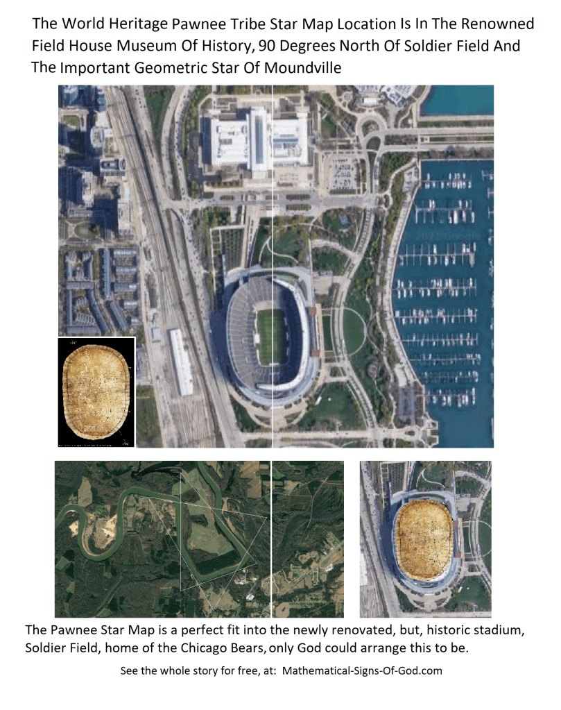 Example of God’s creativeness and good nature: the famous Pawnee star map (see pages) is held at the prestigious Field House Museum, (building just north of Soldier field in photo)… and the Pawnee star map fits perfectly into the perimeter outline of Soldier Field’s stands. This is crazy!