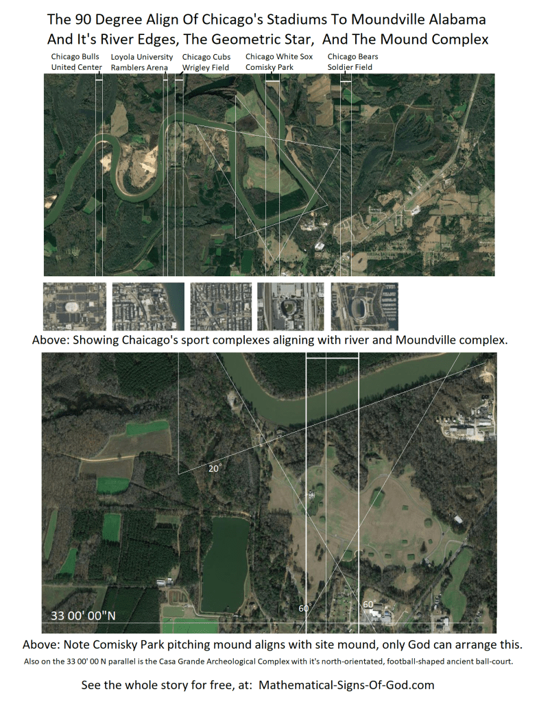 Showing historic Soldier Field and the other historic stadiums and arenas in Chicago aligned with Moundville Archeological complex and the Black Warrior River geometric star with a 10,20,30,40,50,60,70,80,90 degree angles. Note Comisky Park aligned with the mounds of Moundville and star center.