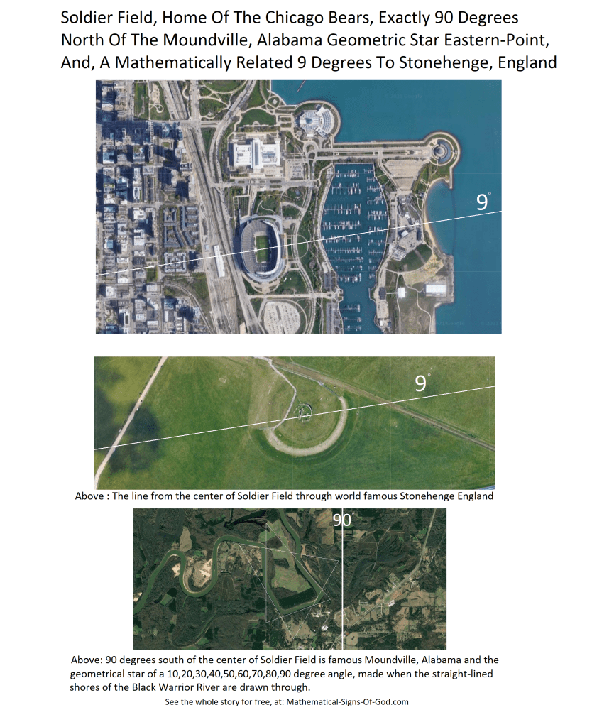 Historic Soldier Field in Chicago on the intelligent 9 degree (1/2 of 18) line, AND, the 90 degree N line to the Moundville archeological complex river geometrical star