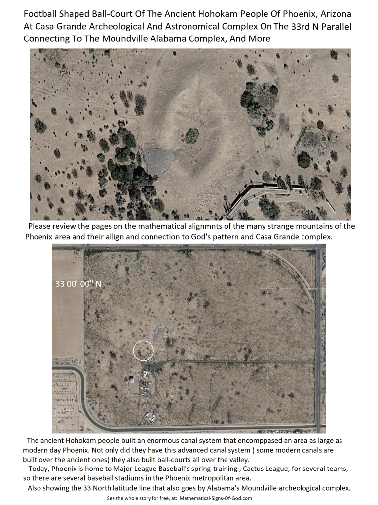 180 degrees west of Moundville, which is on the 33 00′ 00″ N parallel, is famous Casa Grande archeological complex with it’s football-shaped ball-court mini-stadium