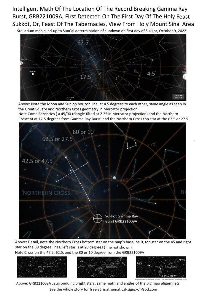 14 Oct 2022 by God's Math Pattern of the Heavens and Earth Record-Breaking Gamma Ray Burst, Most Powerful Explosion Seen, At Same Basic Intelligent Math Angles Of God’s Pattern And The Sinai Wilderness And Holy Mount Sinai. Happy Sukkot, Everybody ! Image Uncategorized Gamma Ray Burst, GRB221009A, Holy Mount Sinai, Sinai Wilderness Leave a comment