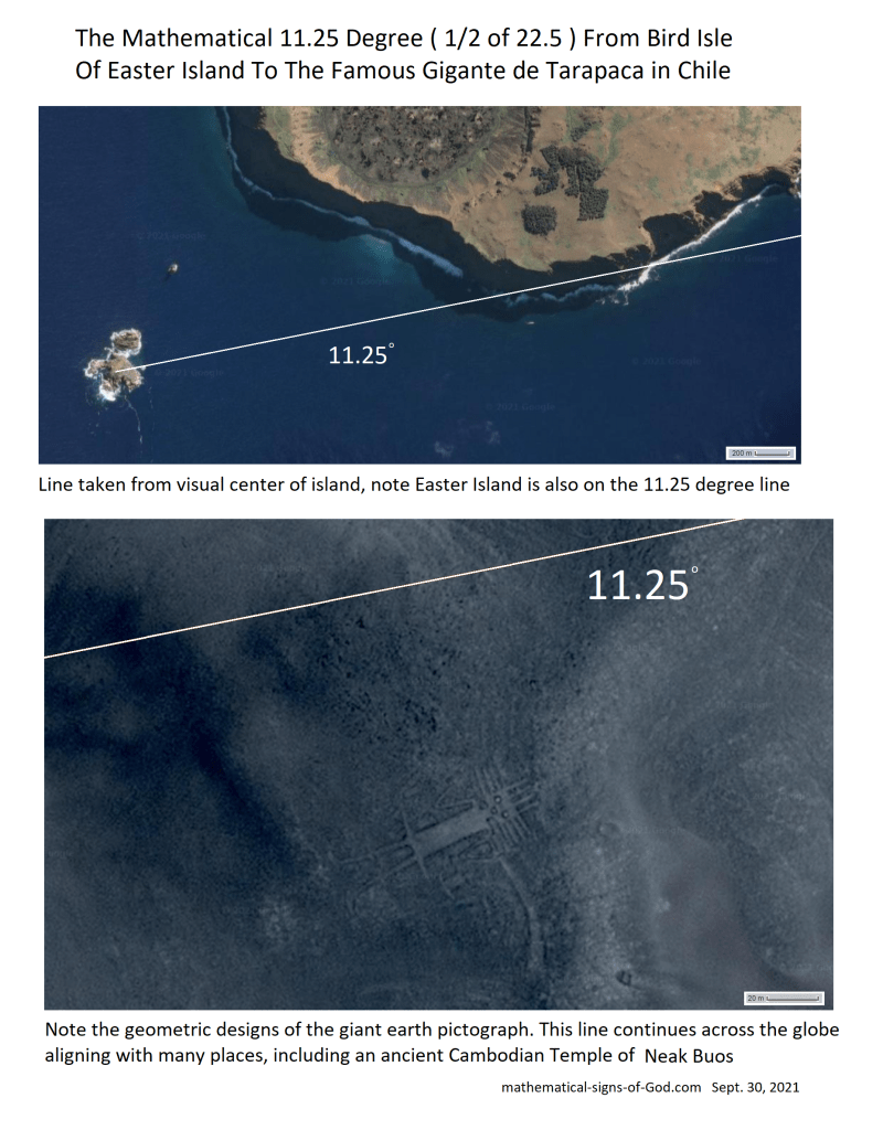 30 Sep 20211 Oct 2021 by God's Math Pattern of the Heavens and Earth New ! The 11.25 ( 1/2 of 22.5 ) Line from Easter Island’s Bird Isle To The Famous Earthwork Of The Giant Of Tarapaca, Chile Image Uncategorized Easter Island, Gigante de Tarapaca, Peru, Tarapaca Giant Leave a comment